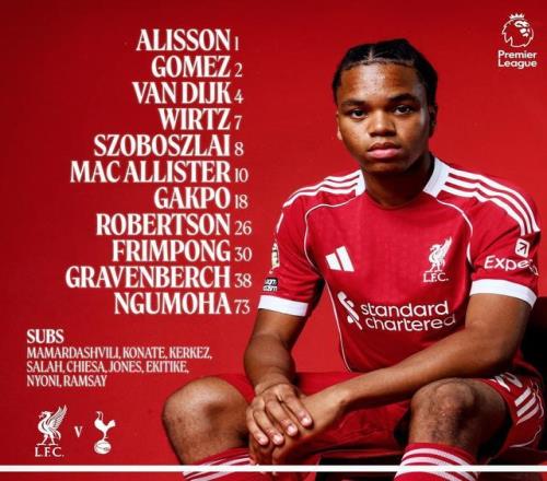 利物浦首发:1-阿利松、26-罗伯逊、4-范戴克、2-乔-戈麦斯、30-弗林蓬、38-赫拉芬贝赫、8-索博斯洛伊、10-麦卡利斯特、7-维尔茨、18-加克波、73-恩古莫哈