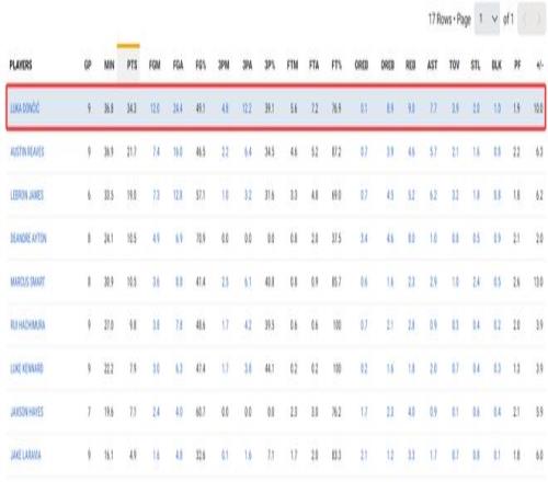 还有一项数据足以证明东契奇的作用,这9场比赛斯玛特正负值+104第一,东契奇在场+90湖人第二,里夫斯+57第三。