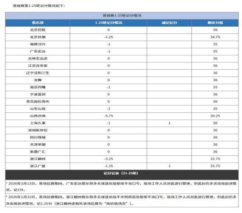主场出现球迷辱骂和不当口号,如果工作人员没有及时进行阻止,或者阻止失败的,主队就会被扣分。作为客队球迷随队前往别队主场有违规行为的,也一样会扣分。这次广东球迷在深圳主场辱骂裁判,就被CBA抓到了,直接扣除广东1分。值得一提的是,这也是广东本赛季首次被扣分。如果扣满12分,那就要罚空场比赛,变相扣钱。