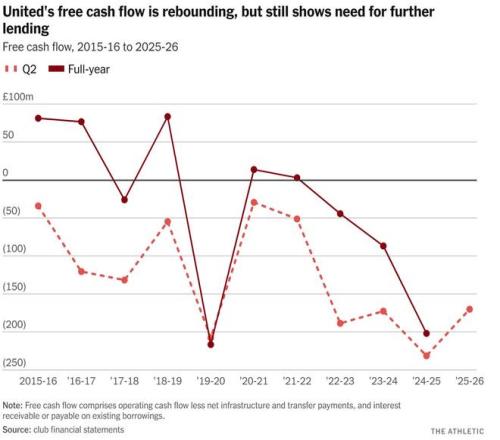 首先,拉特克利夫注入了2.385亿英镑,这笔钱,除了卡灵顿训练基地的工程之外,几乎都花在了转会费和运营成本上。此后,曼联借贷愈发频繁。再加上其他方面的削减,使得在不到两年的时间里,转会总支出超过5亿英镑。曼联从未濒临破产,但一个有趣的假设是,如果没有人出现并注入拉特克利夫投入的那些资金,会发生什么。