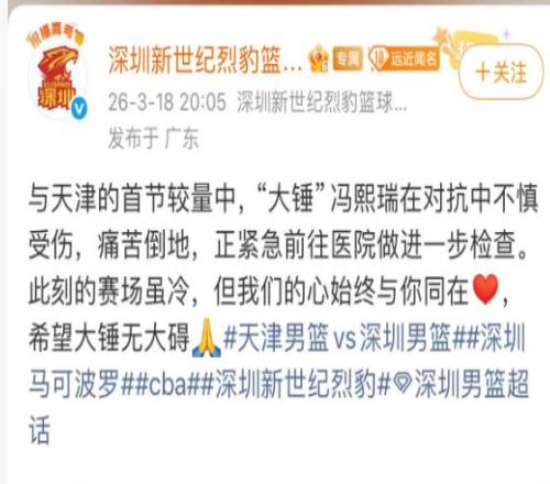 冯熙瑞的具体伤情,还需要等待检查之后,深圳男篮官方的进一步通告。