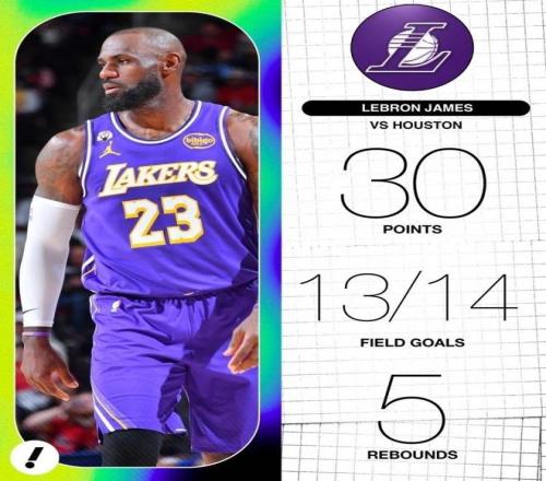 本场比赛,湖人球星詹姆斯上场34分钟,投篮14投13中,得到30分5篮板2助攻1抢断1盖帽。詹姆斯本场的投篮命中率高达92.9%,追平生涯最高纪录。据统计,这是詹姆斯生涯第14场比赛在不超过15次出手得到30+分。