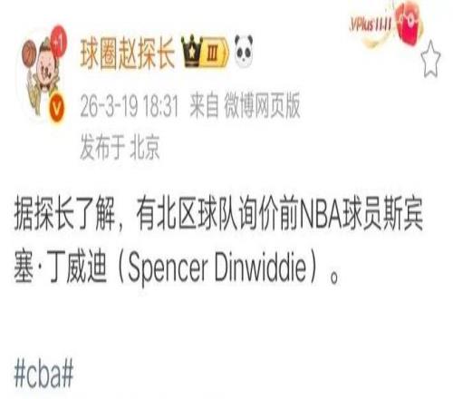 为了冲击总冠军,北京男篮一直在寻找更加合适的小外援人选。之前北京媒体已经报道过,目前北京男篮有两大心仪人选,一个是上赛季在同曦男篮效力的肯德里克-戴维斯,一个是在欧洲打球的球员。就在刚刚,在欧洲打球的这名外援的身份也已经确定了。据媒体人“球圈赵探长”透露,有北区球队询价前NBA球员斯宾塞-丁威迪。
