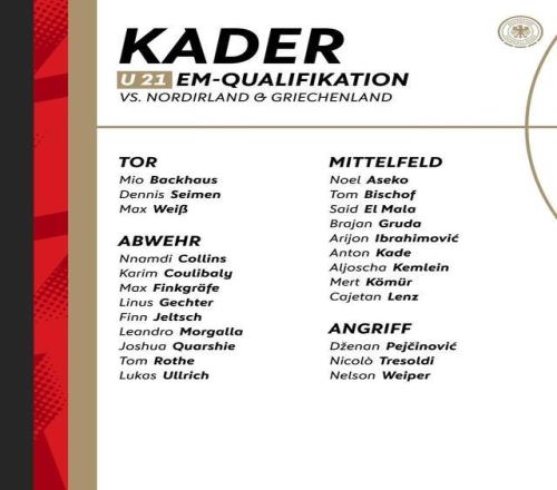 在本月的国际比赛日期间,德国U21国青队将会在U21欧青赛的预选赛中对阵北爱尔兰U21和希腊U21。