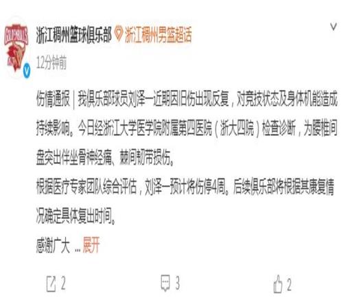 北京时间3月21日,浙江男篮官方公布球队本土顶薪内线刘泽一伤病情况,他近期因旧伤出现反复,前往医院检查后确诊为腰椎间盘突出伴坐骨神经痛、棘间韧带损伤,预计将伤停4周。