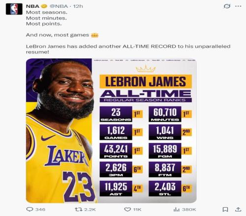 官方为41岁勒布朗戴上皇冠!又冲全新历史第1纪录湖媒转推赞GOAT