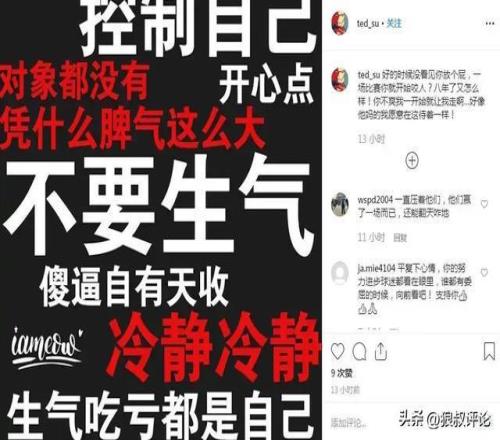 苏若禹还晒出了一张图,图上写着“不要生气”、“控制自己”、“开心点”、“傻X自有天收”、“冷静冷静”等字样。