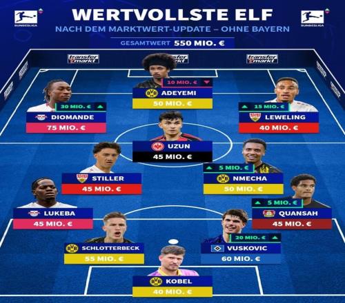 德甲无拜仁球员最贵阵容:阿德耶米、施蒂勒、施洛特贝克在列