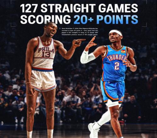 NBA亚历山大得分20+场次超越张伯伦,独居历史第一