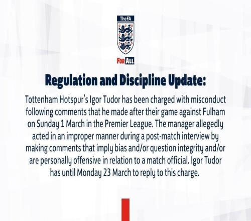 因对阵富勒姆赛后发表不当言论,热刺主帅图多尔被英足总指控